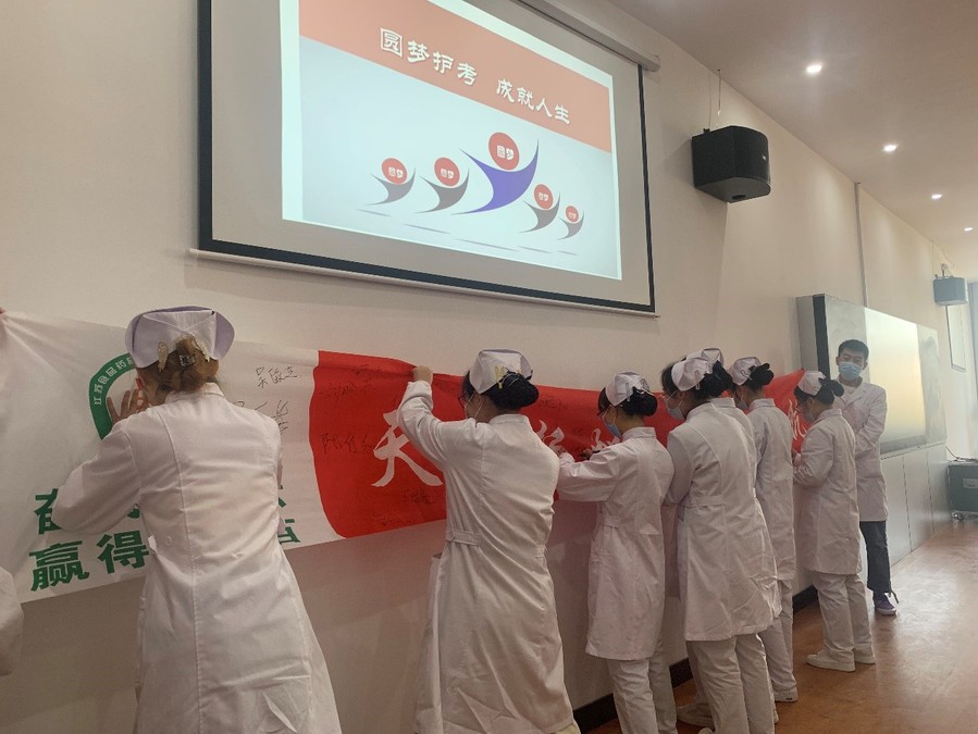 随后,学生代表、教师代表分别针对2021年护士执业资格考试做表态发言。接着特聘教授季宁东做总动员,指出作为护理学院第一届毕业护生,在距离考试的96天里,应该刻苦学习,全力奋战护考,最后都能够圆梦护考,成就人生。