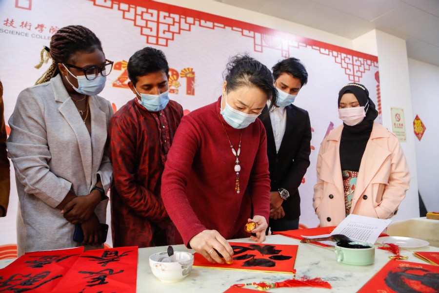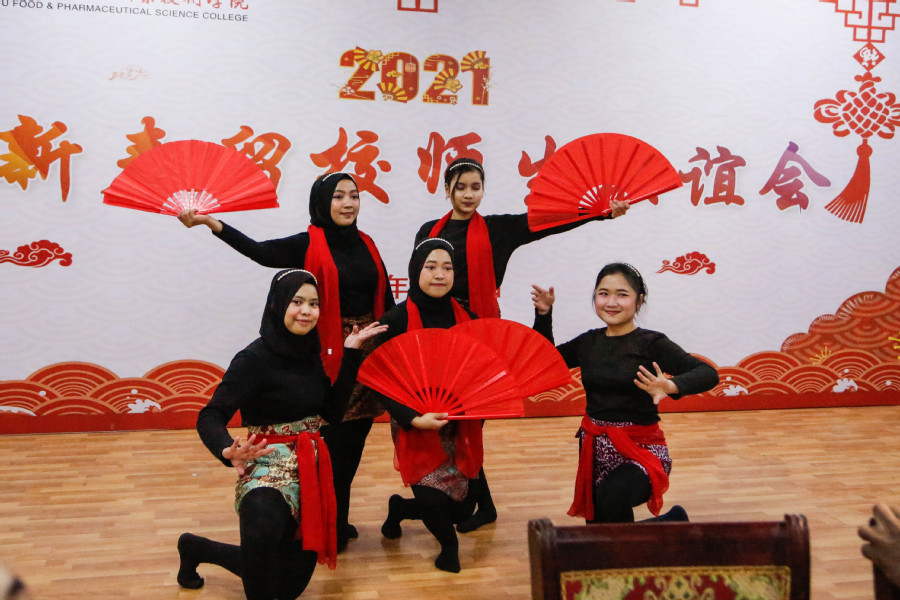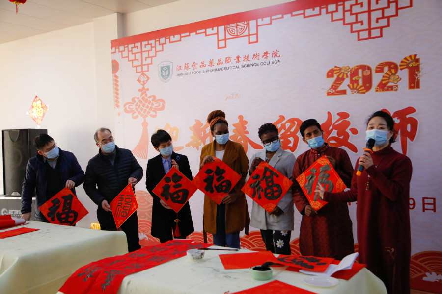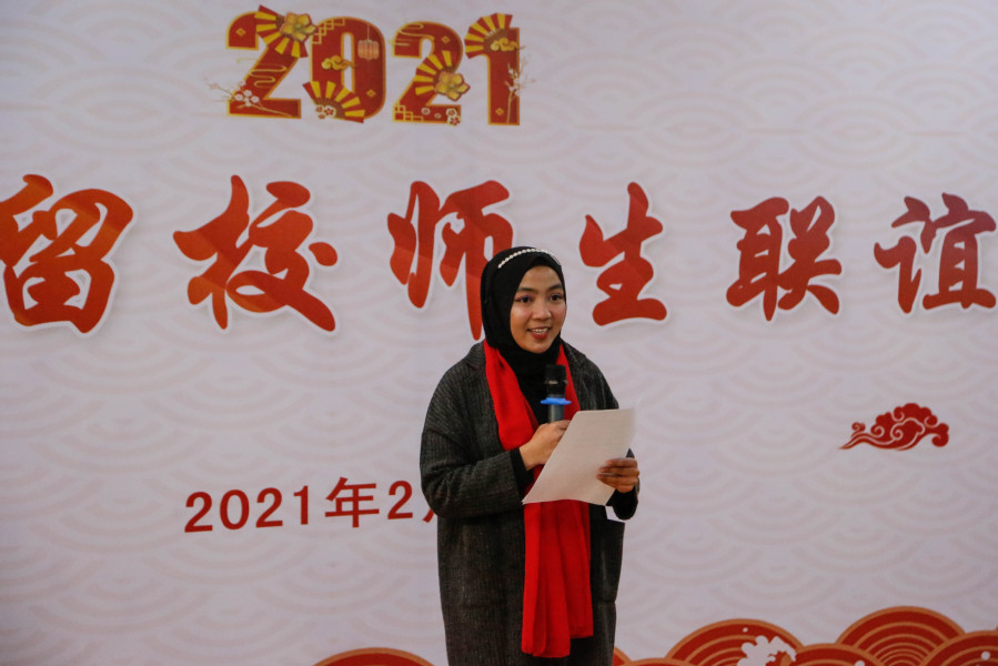 在联欢会上,各国留学生还表演了自己本国的歌舞,学校领导为每一位学生送去了“福”字和新年“红包”,留学生们则手举“福”字,用中文大声喊出“新春快乐,牛年大吉”的口号。