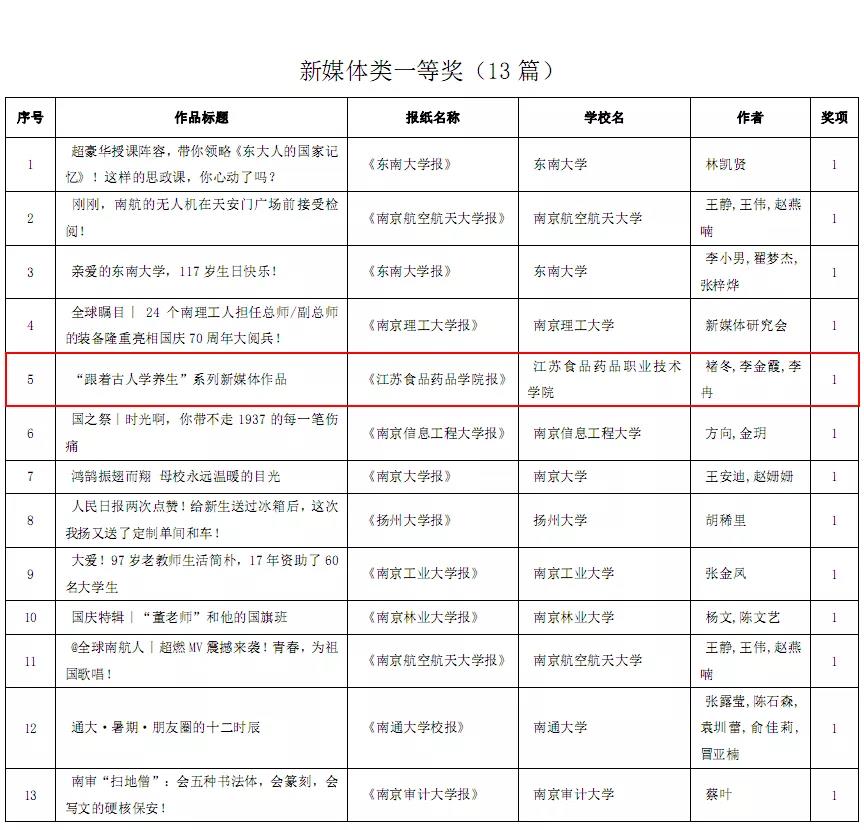 江苏省高校优秀作品分消息、通讯、言论、版面、新闻摄影、文学、新媒体七个类别。在七个类别的作品评选中,荣获一等奖的高职院校仅澳洲10手机版一所,这也是自参加评选以来学校获得的第一个一等奖。