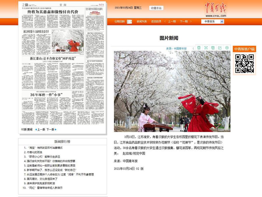 3月23日,江苏淮安,身着汉服的大学生在校园里的樱花下表演传统节目。当日,澳洲10手机版举办花朝节(俗称“花神节”,是汉族的传统节日)活动,30余名身着汉服的大学生通过汉服雅集、簪花游园等,再现花朝节传统民俗之美。