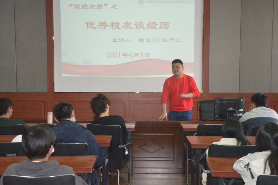 4月9日下午,财贸学院与校友办公室合作组织“谈经论贸之优秀校友谈经验”活动,邀请优秀毕业生原物流101班严江同学分享自己的工作和创业经历。