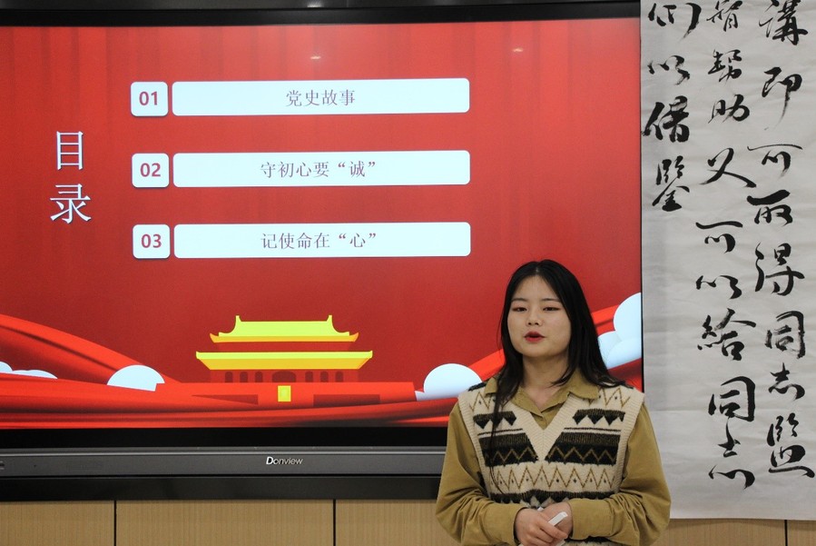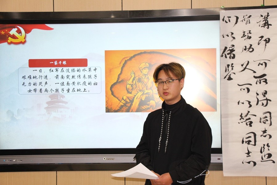 此次活动共分为三个环节,第一环节由机电工程学院党支部学生支部书记严陈为所有学生党员讲党史,上党课。他首先通过视频资料给各位同学带来了半截皮带的故事。流传的一段歌谣:牛皮腰带三尺长,草地荒原好干粮,开水煮来别有味,野火烧熟分外香,一半用来煮野菜,一半用来熬鲜汤,有汤有菜花样多,留下一段战友尝。歌谣的背后是牺牲精神给广大党员带来信仰的希望,号召同学们向革命前辈学习,克服万难、充满信仰。