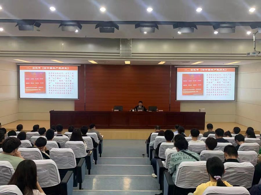 捐赠仪式结束后,薛建明教授以《中国共产党百年征程与中国梦》为主题,从四个方面对中国共产党百年奋斗的光辉历程和历史性贡献等内容进行了全面深刻阐释。薛建明教授说:”我们党的历史是中国近现代以来历史最为可歌可泣的篇章,历史在人民探索和奋斗中造就了中国共产党,我们党团结带领人民又造就了历史悠久的中华文明新的历史辉煌。作为青年一代要永远保持对人民的赤子之心,以不懈奋斗的精神状态和一往无前的奋斗姿态,继续朝着实现中华民族伟大复兴的宏伟目标奋勇前进。”