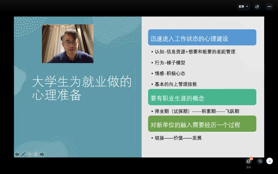 董如峰结合自己十余年为世界500强企业培训的经验以及最新的就业调研报告,深入浅出地向大家分析了当前大学生就业形势和组织环境,展开说明疫情后对专业技能人员需求提升、薪资期待变低、组织环境变得相对宽松灵活,但对个人的自主力要求变高等变化。接着,董如峰从六个方面依次向大家阐明企业对员工职业素养的要求,包括较强的目标感、自我效能感、情绪管理能力、人际沟通能力等。最后,他生动地向大家指出当前大学生就业前应做的心理准备,包括树立职业生涯概念并了知融入新单位、新的社会角色所需经历的过程,以防个人期待与实际能力差距所带来的失望感。在提问环节,董如峰与现场同学连麦,细致回答了同学们所提出的关于职业性格测试与职业生涯规划的问题,并画龙点睛地向大家分享最后的求职锦囊与祝福,同学们纷纷表示讲座收获干货,满载而归。