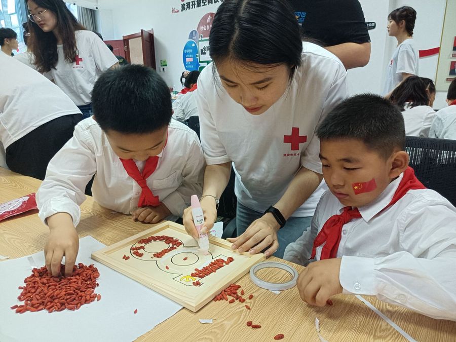 中药拼党旗,携手同传红色基因。志愿者指导小朋友以“党旗”为主题,用红色的枸杞与黄色的金银花粘贴成“国旗”、“党旗”、“红领巾”等一幅幅创意作品,以此致敬伟人。伴随着对使用到的药材及涉及标志的详细讲解,让小朋友们在接触、了解药材名称及功效的同时“铭党恩、树远志”,传承红色基因,沿着革命前辈的足迹携手前行。