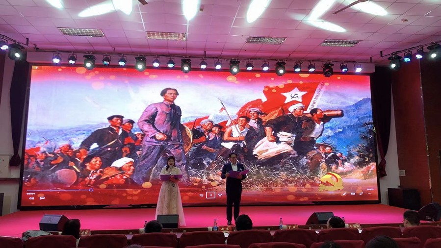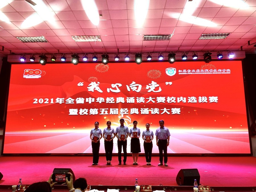选拔赛中,选手们通过多媒体展示手段,满怀深情地朗诵了《我的青春跟党走》、《我的战友邱少云》、《请让我为你点一盏灯》等歌颂建党百年光辉历程、展现举世瞩目伟大成就、体现中华优秀传统文化、革命文化和社会主义先进文化的经典作品和诗文。在铿锵有力的朗读声中,选手与评委观众一起回顾了中国共产党的百年丰功伟绩、感悟了祖国的强大。通过评委们的评判,制药工程学院朱鸿英、嵇娥、王建、王正诵读的《青年中国》获得教师组一等奖,健康学院朗诵队诵读的《我的青春跟党走》、药学院李嘉鑫同学诵读的《军礼》获得学生组一等奖。