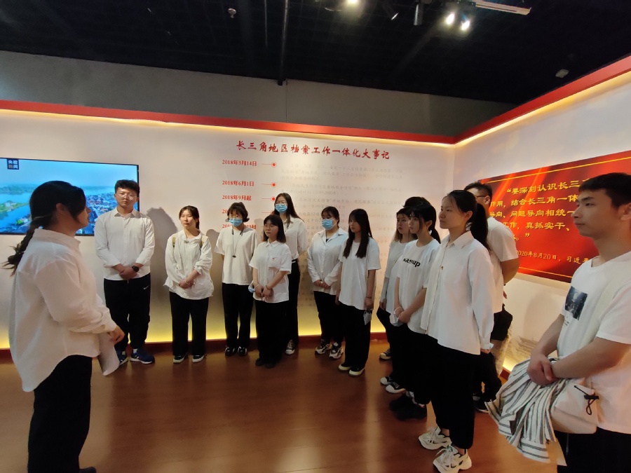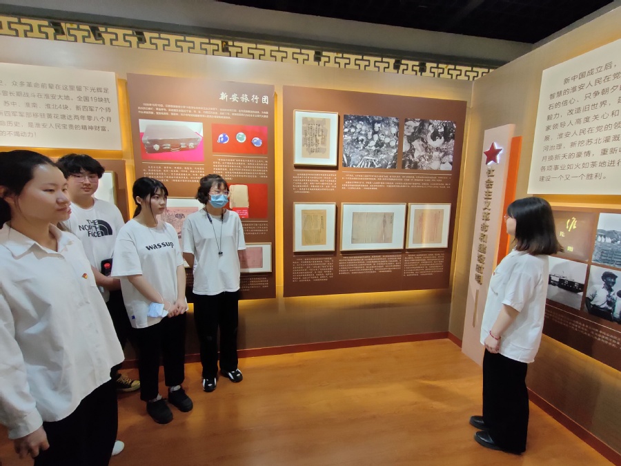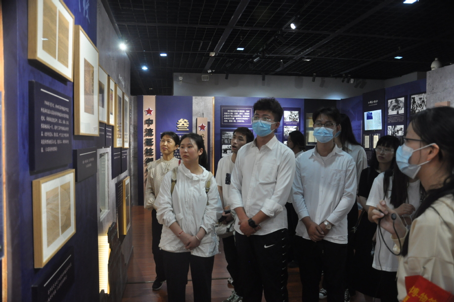 本次活动分四个环节。在宣誓地合影之后,师生跟着讲解员进入主题档案馆。影像、书籍、密信、报刊、地图……展览精选三省一市珍藏的近500件革命历史档案文献和影像资料,通过“开天辟地宏图起”“革命洪流风云咤”“中流砥柱御外侮”“天翻地覆慨而慷”以及“淮安红色珍档”五个板块展示中国共产党坚守初心使命,述说着革命斗争的艰苦卓绝,历经千难万险,谋求民族独立和人民解放的壮阔图景。