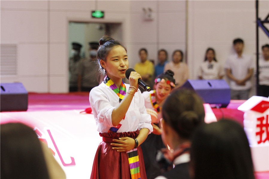 藏族同学向老师们赠送了哈达,次仁曲桑还代表全体藏族学生向学校赠送了锦旗和礼品。
