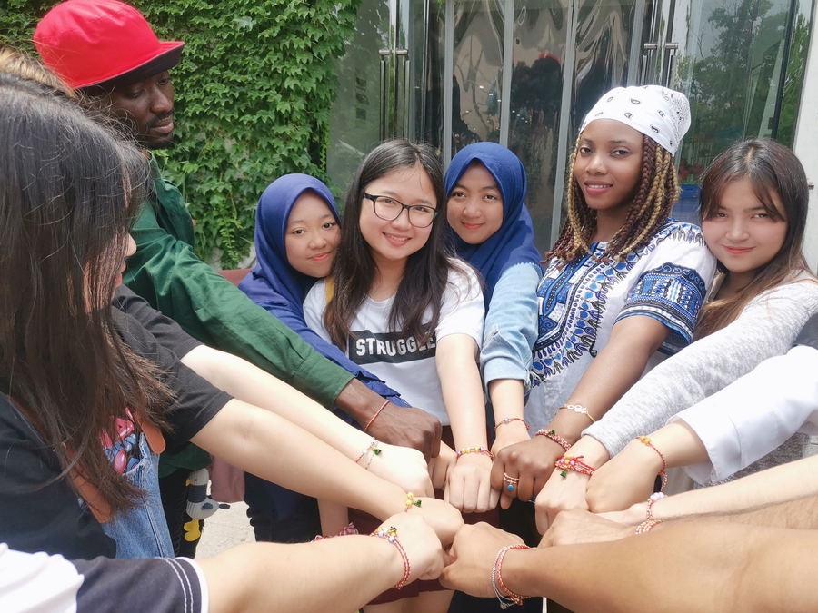 煮粽子时间较长,期间,国教院学生会的中国同学们向留学生介绍了代表五行,具有辟邪、祈福、纳吉等美好寓意的五彩绳的意义,并耐心地教留学生编彩绳。留学生们认真地聆听、专注地编织,感受中国传统节日的魅力。