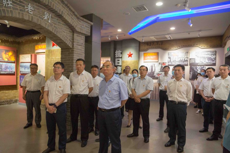 新四军“刘老庄连”曾受到习近平总书记的称赞,他在纪念中国人民抗日战争暨世界反法西斯战争胜利75周年座谈会讲话中指出,新四军“刘老庄连”等众多英雄群体,就是千千万万抗日将士的杰出代表。刘老庄八十二烈士先后入选全国“双百”人物和第一批著名抗日英雄群体。在伟岸庄严的纪念碑前,烈日下,全体党员集体向英勇献身的烈士敬献花篮、致默哀,面向党旗,举起右拳,面向鲜红的党旗重温入党誓词,发出了为共产主义奋斗终身的铮铮誓言。