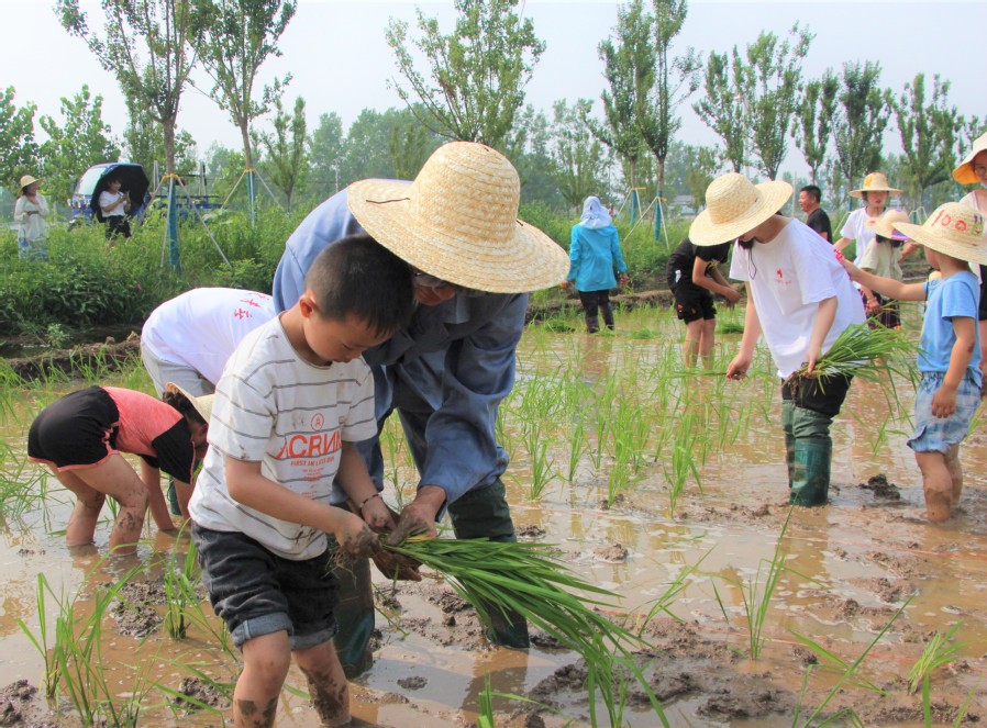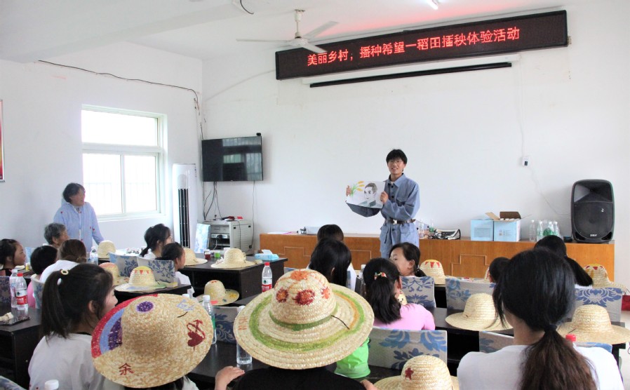 6月26日下午,药学院博爱青春志愿服务队联合省委驻淮帮扶工作队及希望社工赴三树镇新星村,为那里的留守儿童上了一堂别样的“稻田插秧”劳动实践课。