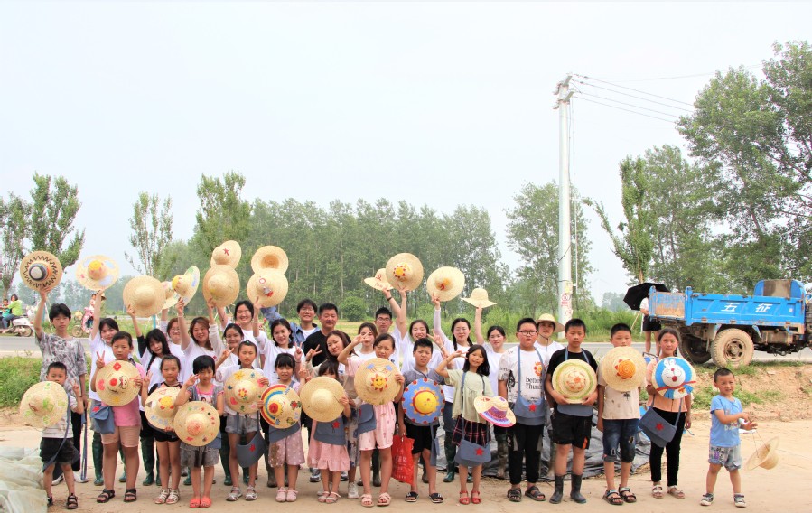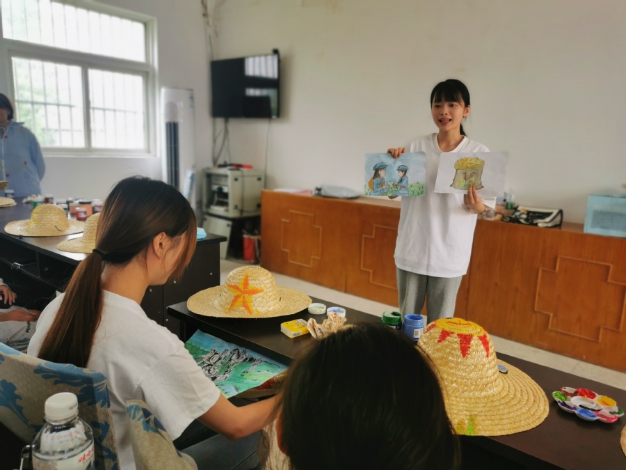 活动开始前,志愿者向孩子们分发了草帽、画笔、颜料等所需材料和工具,他们一边为孩子们细致的讲解调色方法和绘画方式,一边手把手教他们调色、上色。在志愿者的指导下,孩子们挥动着画笔,认认真真的走进自己的艺术创作里。党徽、红星、神舟飞船……一个个形式多样、风格各异的草帽展现在眼前。红色的历史为普普通通的草帽增添了不一样的意义,党的恩情也铭记在孩子们的心上。