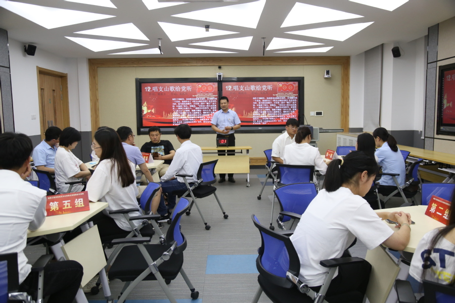 制药工程学院三十余名师生分成六组,一起听红歌,抢答竞猜歌名,听到耳熟能详情深意浓的歌曲时,大家不由自主地跟着一起哼唱。《保卫黄河》、《没有共产党就没有新中国》、《唱支山歌给党听》、《团结就是力量》、《十送红军》、《山丹丹花开红艳艳》等歌曲播放时,抢答到的小组集体起立领唱,掀起高潮,气氛热烈欢快,在场的每一位都感受到红歌的强大正能量,并备受鼓舞。竞答期间,党总支书记王涛济为大家上音乐党课,讲解每一首红歌的创作背景、音乐风格和时代意义。一首首红歌,让大家在艺术熏陶中学习党史,在革命故事中感悟中国共产党人的初心与使命。