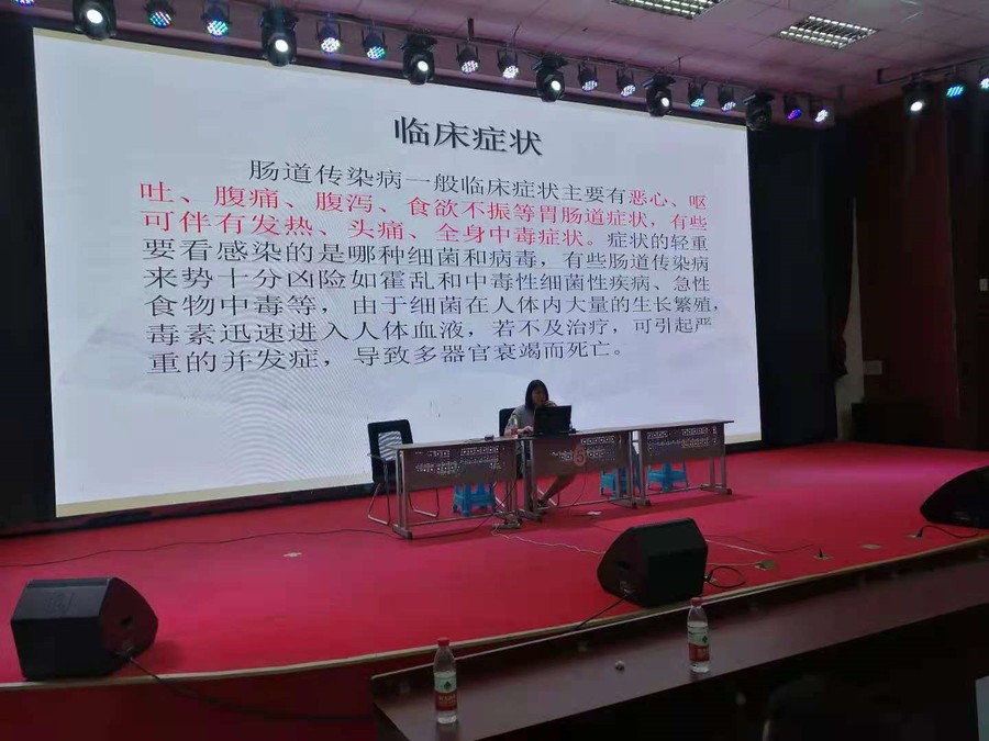 首先,邱晨医生分别向同学们介绍了夏季常见传染病的常见知识和如何防治。其次,严院长详细介绍了肠道传染病的产生、生存环境、传播途径及详细的预防措施,让同学们对预防知识有了进一步的了解,也学习到了如何预防等基本知识。