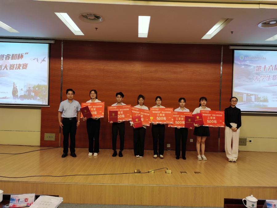 为确保本次大赛评审科学规范,大赛共邀请了5位大学生职业生涯规划领域知名专家和南京康誉睿和健康管理有限公司人力资源总监李芳芳女士共同担任评委,确保评审的公开、公正、科学、规范。评委老师针对每位选手的陈述内容进行了提问,评委组组长施坚书记对比赛进行了总结点评。最后,由5位评委、学校就业创业指导中心於文刚主任和南京康誉睿和健康管理有限公司人力资源总监李芳芳女士共同为获奖选手颁发奖金和荣誉证书。