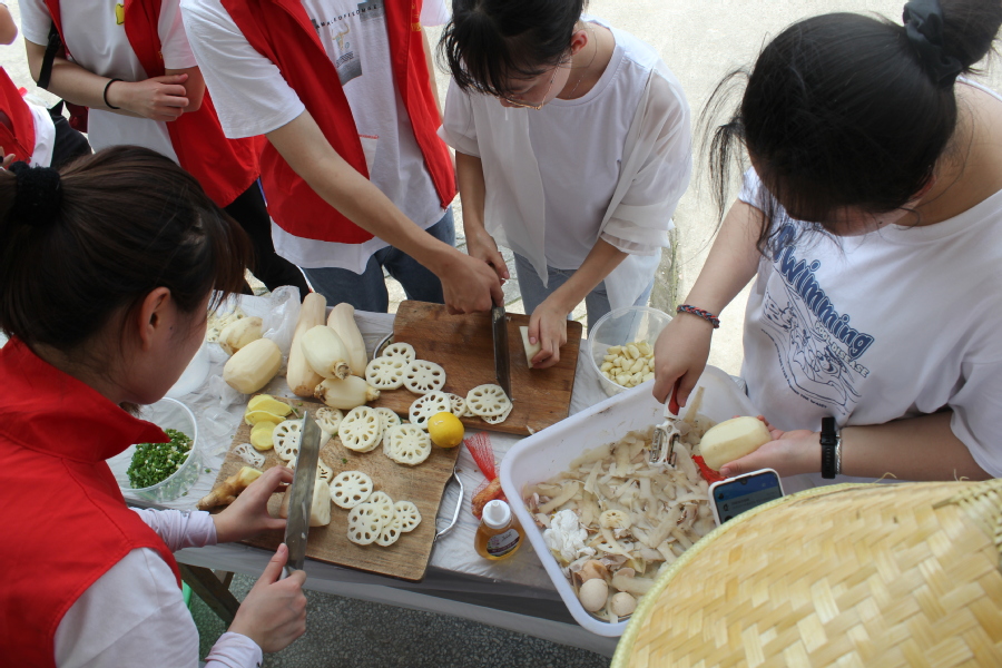 就地取材,烹饪美食。此次的劳动教育课堂还充分结合了酒店学院的专业特色,同学们就地取材,以莲藕、龙虾作为主要原料,由烹饪专业的同学们掌勺,为辛勤劳动的村民们烹制了一道道色香味俱全的美食。切藕、洗虾、剥蒜、摆盘…大家忙的不亦乐乎,虽然当天气温高达36度,但所有人一刻也没有停歇,看着村民们带着美食兴高采烈回家的模样,所有人都露出了喜悦的笑容。