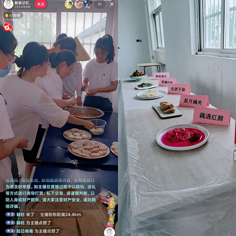 抖音直播,电商助农。参与活动的志愿者只有20人,如何能扩大这次劳动教育的受众、进一步提升浸润式体验效果呢。为了解决这一问题,酒店学院的师生们在活动前展开了充分的讨论,最终决定以抖音直播的方式全程展示。带队的尹露露老师更是现场化身“带货主播”,向网民们积极推介当地的珍珠苹果藕,并向大家展示了乡村振兴战略下的美丽乡村面貌,呼吁广大青年要珍惜生活、热爱劳动,未来积极投身脱贫攻坚和乡村振兴伟大实践中,为农业强、农村美、农民富贡献更多智慧和力量。短短两个小时的直播吸引了近2000网友在线观看,点赞量达3.8万。通过直播互动,大家纷纷表示,这样的课堂充满了正能量,希望有机会也可以参与其中。