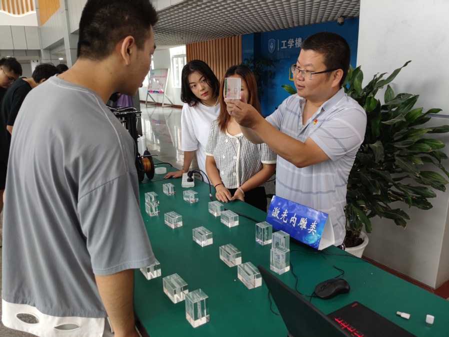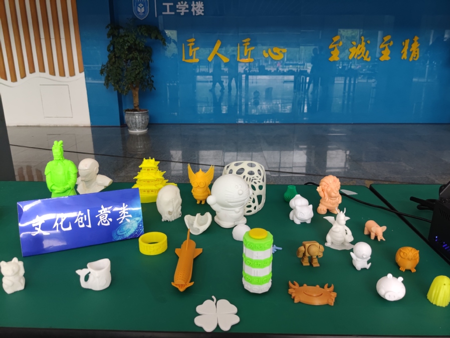 该课程主要通过逆向工程和快速成型技术的学习,培养学生正、逆向机械设计的基本能力以及与相关技术领域结合的综合能力,同时通过三维打印的学习,培养学生3D打印工艺设计以及3D打印设备调试与操作的能力。学生结合课程所学知识和爱好自主选择党史教育、机械电子、文化创意、激光内雕四个模块内容进行设计与创作。学生从自身兴趣爱好出发,积极探四类作品的特点,查阅相关资料,最终做成相关产品。每个同学都能在课程中有所锻炼,也对3D打印有了深入的认识。前来参观的同学们被这些新奇的3D打印作品吸引住了,爱不释手,现场气氛活跃。机电191班同学还在现场演示如何设计3D作品及打印作品。