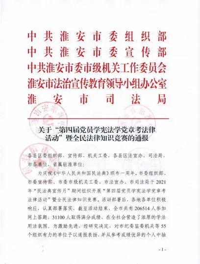 近日,淮安市法治宣传教育领导小组办公室等五部门联合印发《关于“第四届党员学宪法学党章考法律”暨全民法律知识竞赛的通报》,澳洲10手机版获评先进集体。