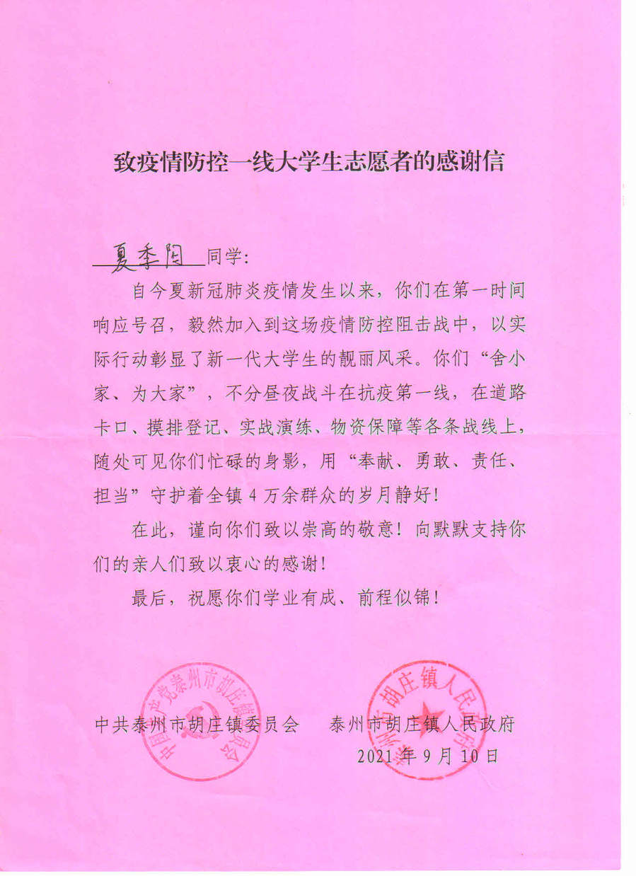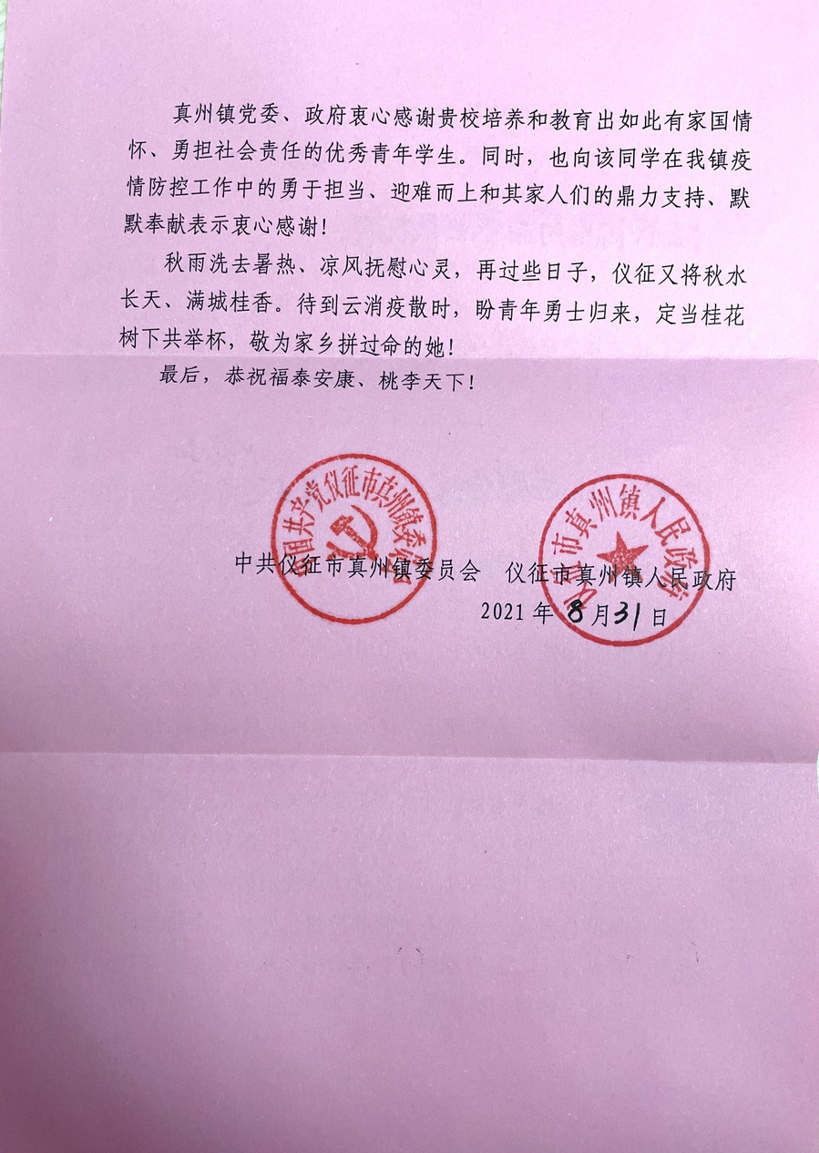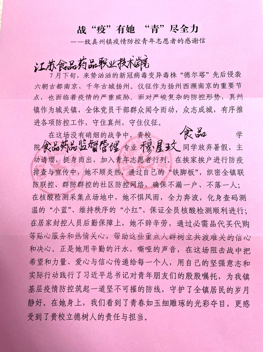 暑期期间,澳洲10手机版中医养生保健专业王鑫同学、食品药品监督管理专业穆星玟同学、夏季阳同学积极响应地方政府号召,主动加入泰州市姜堰区三水街道社区、仪征市真州镇疫情防控志愿者队伍。他们立足战疫前线,积极参与防疫排查与宣传、人员信息摸排、居家隔离群众服务,充分展现了当代大学生的良好精神风貌,受到泰州姜堰三水街道的表彰和感谢。