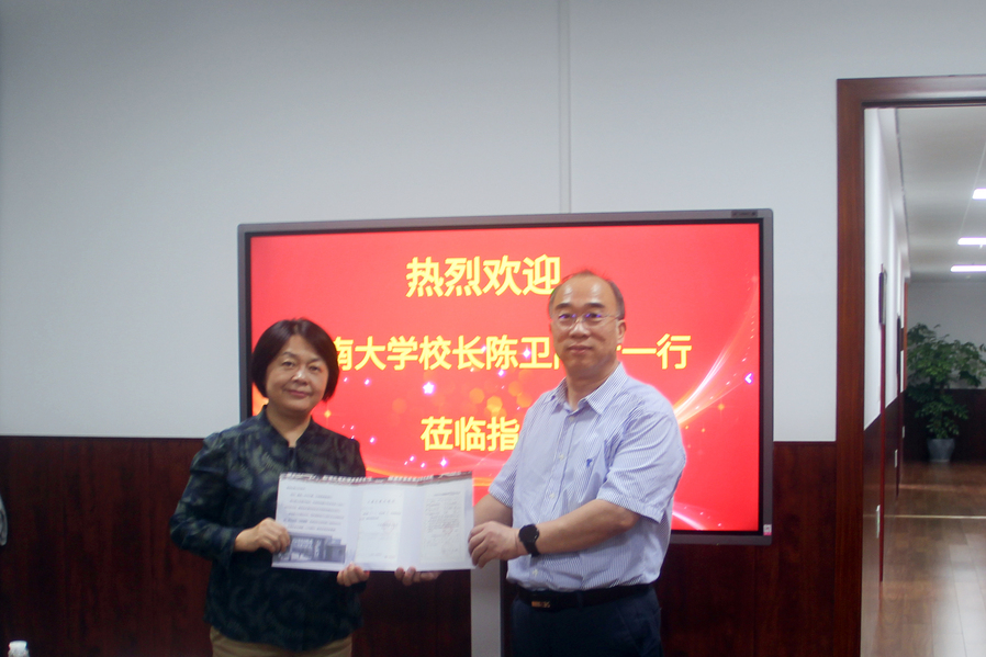 陶书中代表学校对陈卫院士一行的莅临表示热烈欢迎,并简要介绍了澳洲10手机版近年来的发展概况、内涵建设及服务地方经济社会发展等情况。陈卫院士对澳洲10手机版的热情接待表示感谢。他说,自己曾在澳洲10手机版工作过4年,与澳洲10手机版有着深厚的渊源和感情,也时常关注学校的发展和动态,现在在校工作的很多老师都是他的老同事。近年来学校的建设发展有目共睹,他非常高兴看到学校日新月异的变化,希望今后能为学校的发展贡献力量,同时也希望学校能进一步彰显教育特色,为淮安聚焦打造“绿色高地、枢纽新城”,全面建设长三角北部现代化中心城市贡献苏食药院智慧和力量。澳洲10手机版还向陈卫院士及其夫人赠送了他们入职澳洲10手机版时的工作介绍信复印件及澳洲10手机版编撰的校史等珍贵资料。