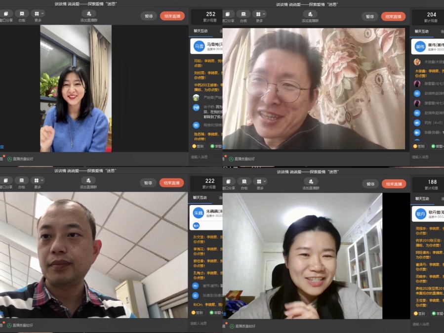 直播活动由心理中心主任李婉君主持,她以爱情发生、发展和结束的历程为脉络,邀请江苏师范大学敬丹萤老师、南京工业大学朱巍巍老师、南京财经大学崔伟老师和南京传媒学院马雪梅老师分享爱情故事和爱情观点。嘉宾们在直播中提到爱情并不是生活的全部,而是珍贵的相遇;爱情是帮助个体认识自我,重现建立自我的重要载体;爱情的经营需要智慧、需要学习、需要练习表达爱和接受爱的方法;爱情的结束需要“仪式感”,告别也是人生重要的功课。此外,嘉宾们就“爱情是否需要门当户对?”“爱情中的男女差异从何而来?”“分手到底是伤害还是成长”等话题展开了讨论。线上的同学们通过公屏发弹幕和申请联麦的方式进行了爱情观的分享。