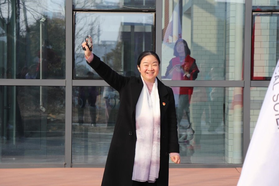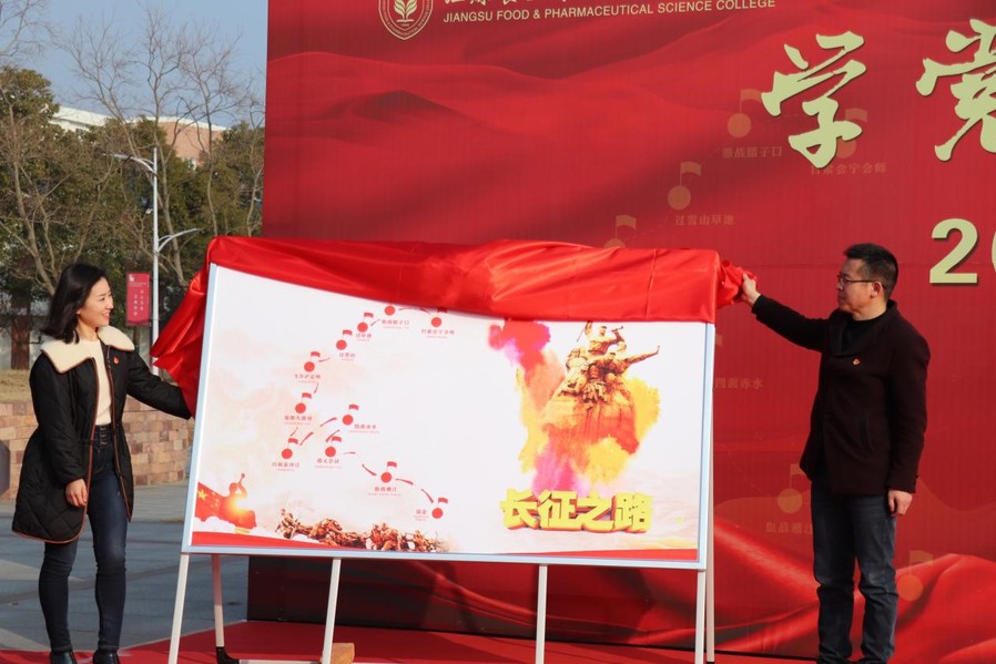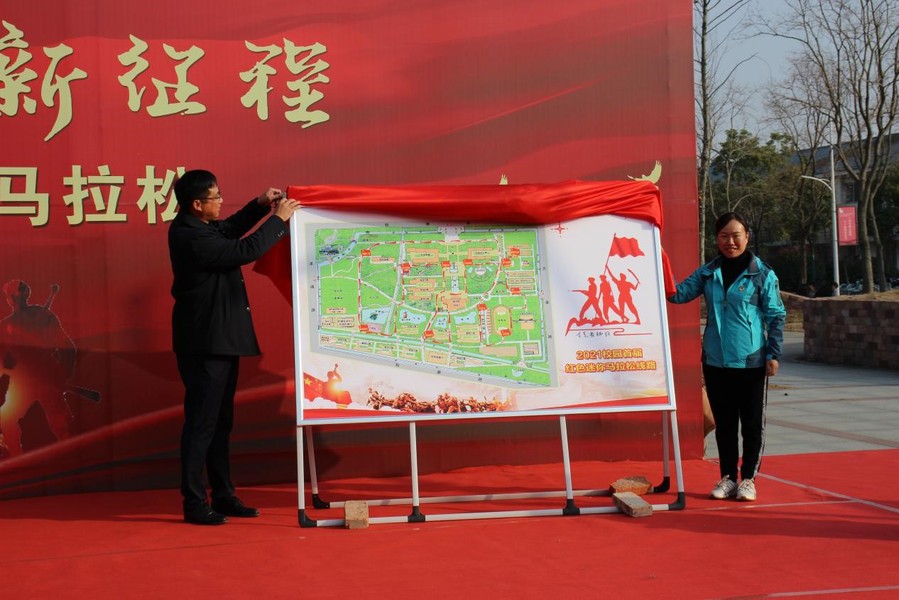 此次活动现场两个路线图极为醒目,一个是红军长征路线图,另一个是对应长征路线设计的校园红色迷你马拉松的路线图,在校园地图中标注了长征中11个重要的地图打卡点。朱劲松处长、杨玥书记、李琴院长、李文生主任分别为跨越85年时空的长征线路图揭幕。