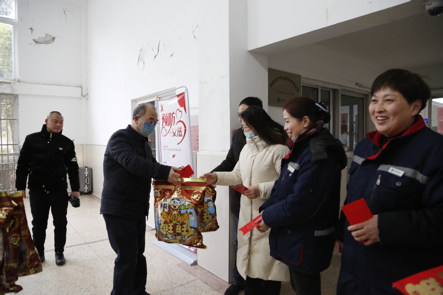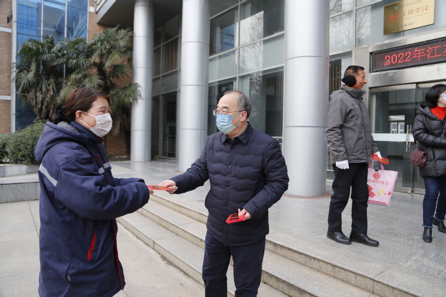 陶书记一行先后看望并慰问了保卫处、教学楼、宿舍楼、饮食服务中心、留学生宿舍楼等场所的值班人员,并代表学校向大家致以新年问候,送上新春祝福。并向大家发放了代表学校心意的红包。对大家在春节期间仍坚守工作岗位、全力做好学校服务保障工作表示衷心的感谢。受慰问的教职工对学校的关怀表示感谢,并保证一定会竭心尽力、坚守岗位,创造和谐稳定的校园环境。