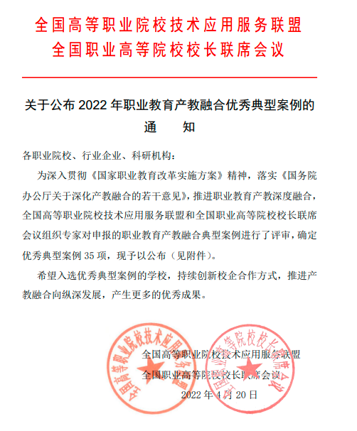 为深入贯彻《国家职业教育改革实施方案》精神,落实《国务院办公厅关于深化产教融合的若干意见》,推进职业教育产教深度融合,全国高等职业院校技术应用服务联盟和全国职业高等院校校长联席会议组织专家对申报的职业教育产教融合典型案例进行了评审,确定优秀典型案例 35 项,澳洲10手机版酒店学院撰写的“基于产业学院的‘一体四融’烹饪工匠人才培养的探索与实践”成功入选,位列第八位。