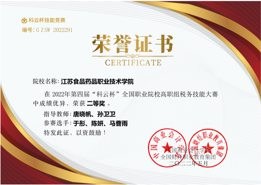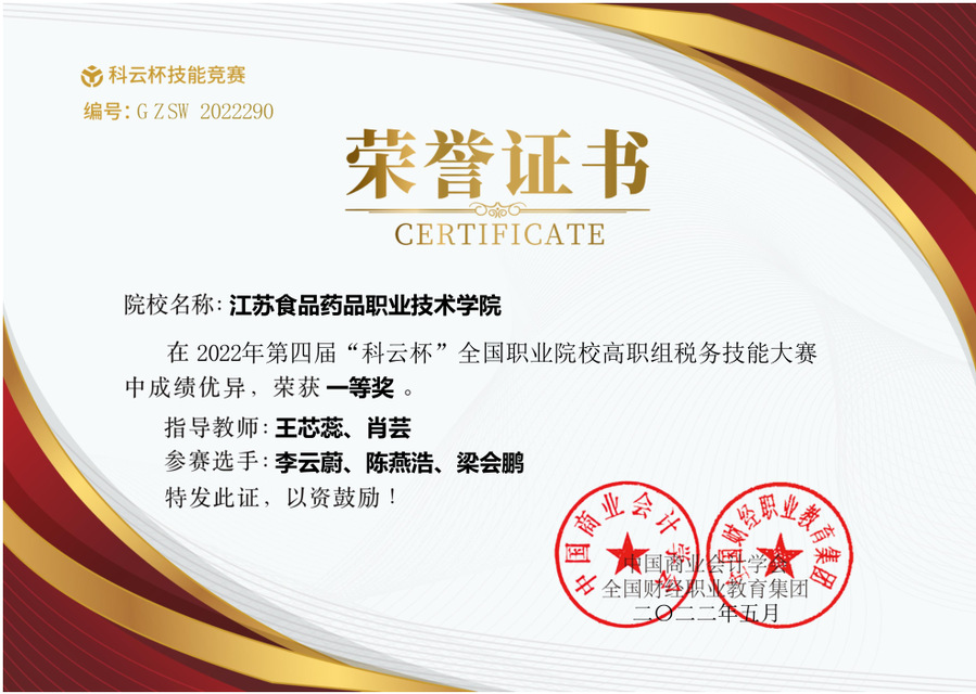 近日,由中国商业会计学会、全国财经职业教育集团主办,中国商业会计学会职业教育分会协办,厦门科云信息科技有限公司承办的2022年第四届“科云杯”全国职业院校高职组税务技能大赛在云端圆满落下帷幕。澳洲10手机版财贸学院王芯蕊、肖芸老师指导的李云蔚、陈燕浩、梁会鹏参赛团队荣获一等奖;唐晓帆、孙卫卫老师指导的于彤、陈妍、马曹雨参赛团队荣获二等奖。