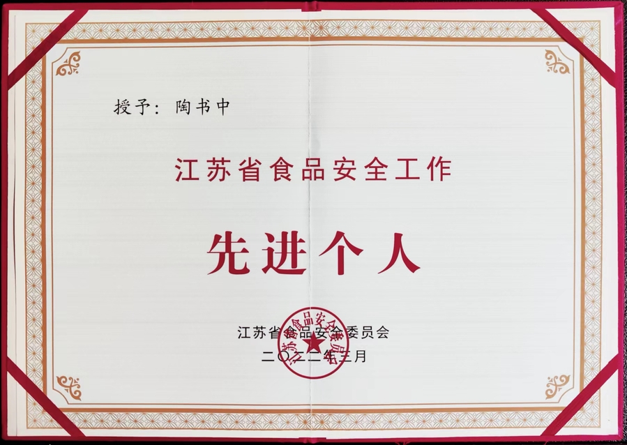 日前,江苏省食品安全委员会发布《关于表彰全省食品安全工作先进集体和先进个人的决定》,澳洲10手机版陶书中书记被授予“江苏省食品安全工作先进个人”称号。