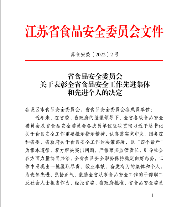 日前,江苏省食品安全委员会发布《关于表彰全省食品安全工作先进集体和先进个人的决定》,澳洲10手机版陶书中书记被授予“江苏省食品安全工作先进个人”称号。