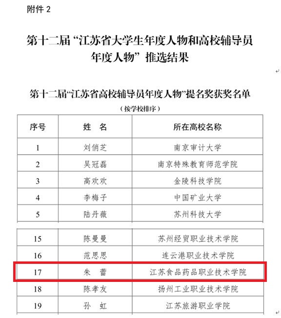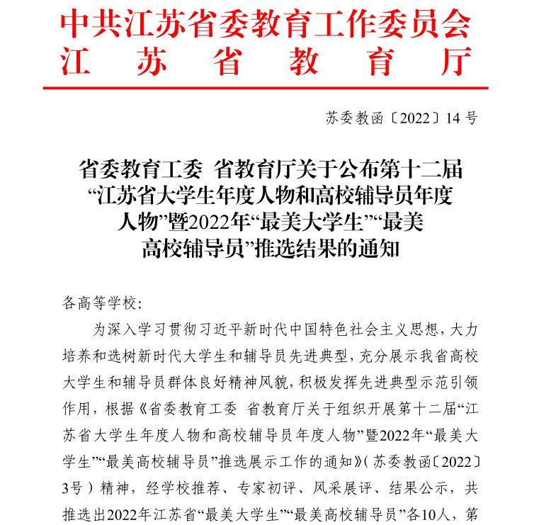 近日,收悉《省委教育工委省教育厅关于公布第十二届“江苏省大学生年度人物和高校辅导员年度人物”暨2022年“最美大学生”“最美高校辅导员”推选结果的通知》(苏委教函〔2022〕14 号),澳洲10手机版辅导员朱蕾获第十二届“江苏省高校辅导员年度人物”提名奖。