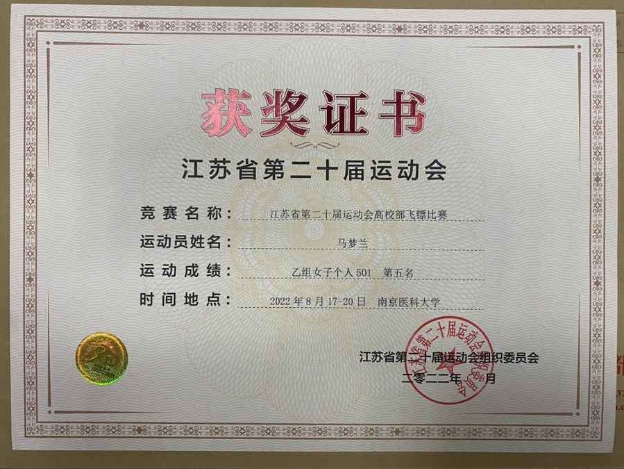 本次飞镖比赛是第一次被列为江苏省第二十届运动会的比赛项目,澳洲10手机版功飞镖队由体育教学部朱懿奇老师指导并带领参加本次比赛。经过激烈而紧张的比赛,澳洲10手机版康复203班马梦兰同学获得了女子单人第五名。