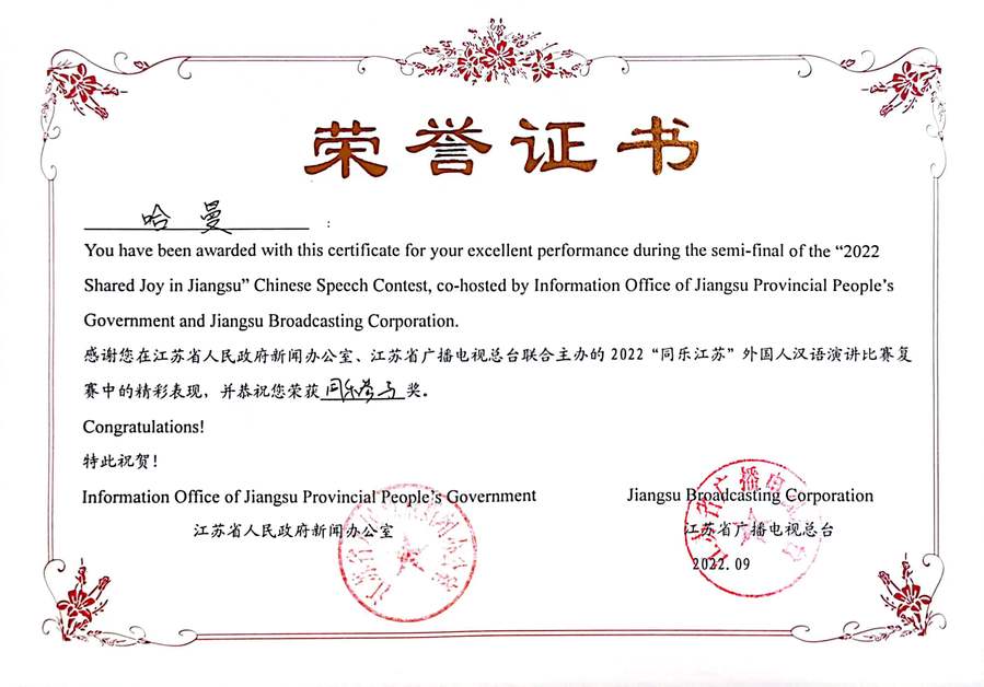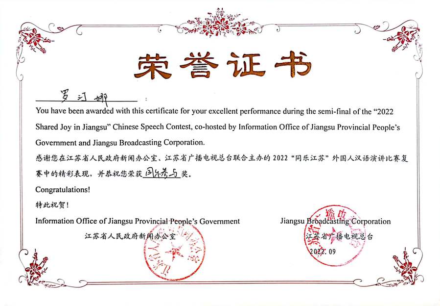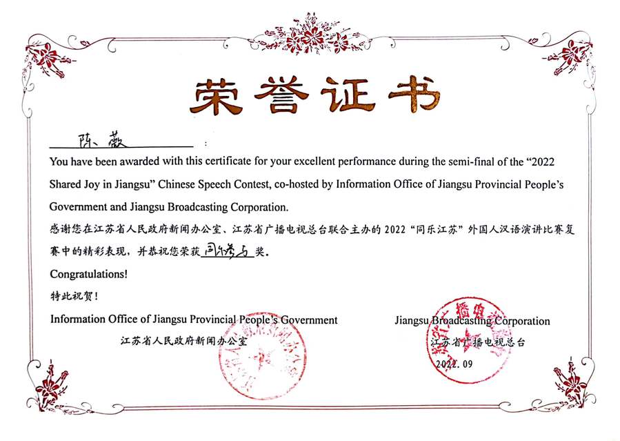 2022年10月,澳洲10手机版4名留学生荣获2022“同乐江苏”外国人汉语演讲比赛“同乐参与”奖,该比赛由江苏省人民政府新闻办公室、江苏省广播电视总台联合主办,本次比赛内容为中国古诗词诵读,通过比赛,学生对中国传统文化的理解进一步加深,汉语能力也得到了极大提高。