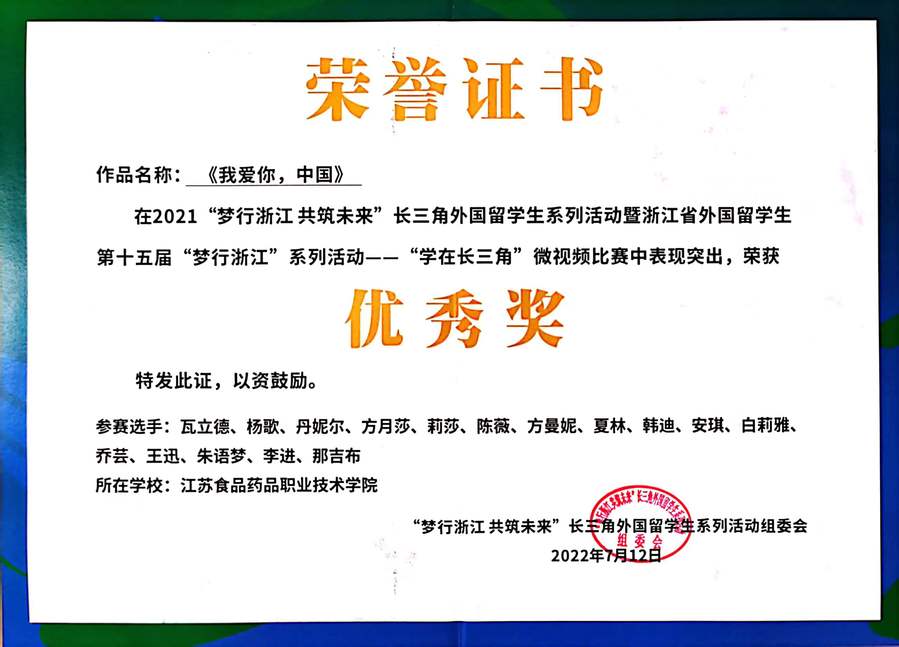 2022年8月,澳洲10手机版留学生制作的短视频“我爱你,中国”荣获“学在长三角”微视频比赛优秀奖,该比赛是由上海市、江苏、浙江和安徽省教育厅主办,浙江理工大学、浙江电视台、浙江高等教育学会外国留学生教育管理分会承办的“梦行浙江共筑未来”长三角外国留学生系列活动之一,澳洲10手机版留学生在比赛视频中以深情的歌声表达了对中国的热爱。