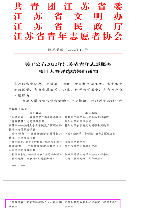 近日,由共青团江苏省委联合省文明办、省民政厅、省青年志愿者协会共同开展的2022年第六届中国青年志愿服务项目大赛江苏省选拔赛(以下简称“省赛”)落下帷幕。澳洲10手机版制药工程学院“智耀青春”实践团——中草药种植助力乡村振兴实践项目荣获项目评选二等奖。