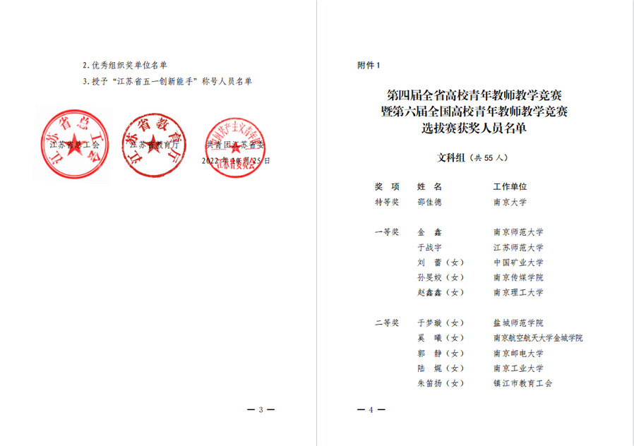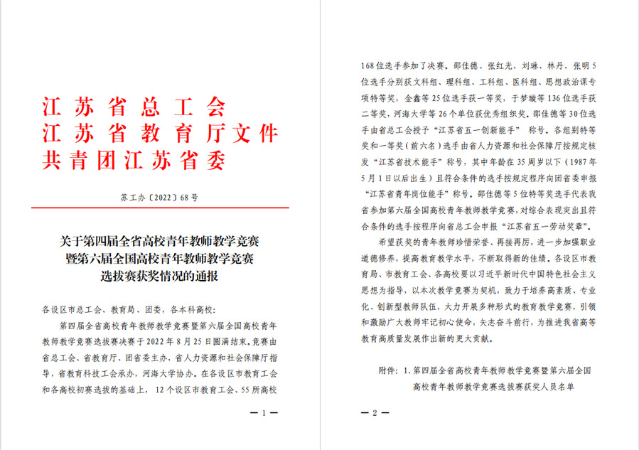 2022年8月,第四届江苏省高校青年教师教学竞赛在河海大学落下帷幕,澳洲10手机版国际教育学院王碧君老师荣获文科组二等奖。竞赛由省总工会、省教育厅、团省委主办,省教育科技工会承办,省人力资源和社会保障厅指导,河海大学协办,来自全省55所高校的168名选手经过层层选拔,进入决赛。决赛分为文科、理科、工科、医科、思想政治课专项五个组别,以“上好一门课”为理念,由教学设计、课堂教学、教学反思和课程思政建设基础知识测试四部分组成,澳洲10手机版教师代表淮安市教育工会文科组参赛。