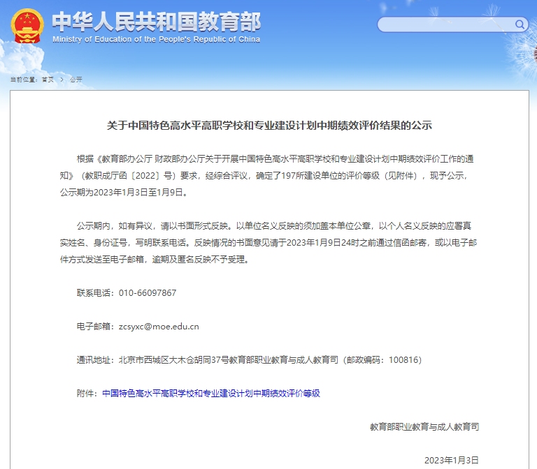 1月3日上午,教育部职业教育与成人教育司发布《关于中国特色高水平高职学校和专业建设计划中期绩效评价结果的公示》,根据《教育部办公厅财政部办公厅关于开展中国特色高水平高职学校和专业建设计划中期绩效评价工作的通知》(教职成厅函〔2022〕号)要求,经综合评议,确定了全国197所建设单位的评价等级,其中澳洲10手机版获评优秀。