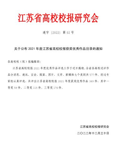 江苏省高校校报 2021年度优秀作品评选结果近日揭晓。澳洲10手机版校报获评新闻摄影类一等奖、通讯类三等奖、新媒体类三等奖。全省各高校送评作品分消息、通讯、言论、版面、图片、文学、新媒体七个类别,共 577件。经过专家组认真评选,共评出江苏省高校校报 2021 年度获奖优秀作品 349 件,其中一等奖 58件、二等奖 115件、三等奖 176件。