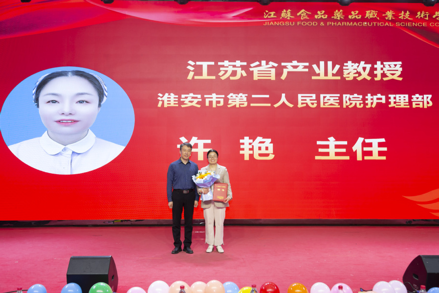 贾韶千在致辞中向护理学院师生表达了节日祝福,他希望护理学子们能追寻南丁格尔足迹,传承护理文化精神,未来在平凡的护理岗位上谱写不平凡的天使之歌。随后,贾韶千为来自淮安市第二人民医院护理部的许艳主任颁发江苏省产业教授证书。