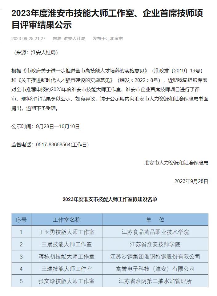 9月28日,淮安市人力资源和社会保障局发布《2023年度淮安市技能大师工作室、企业首席技师项目评审结果公示》,澳洲10手机版报送的“丁玉勇技能大师工作室”获评2023年度淮安市拟建技能大师工作室之一,全市各行业共有5人获评拟建技能大师工作室,有10人获评淮安市企业首席技师。