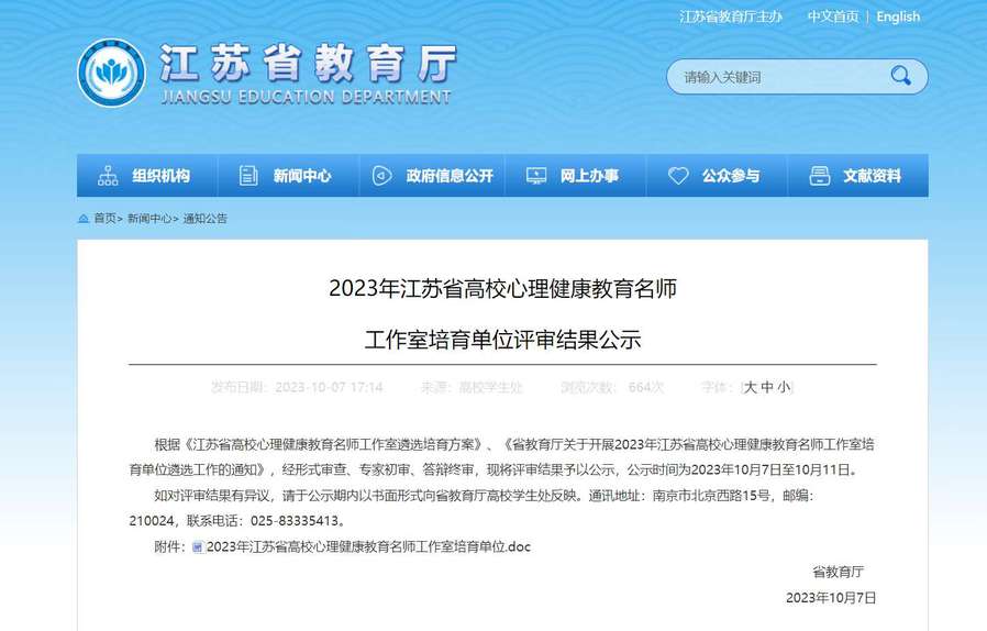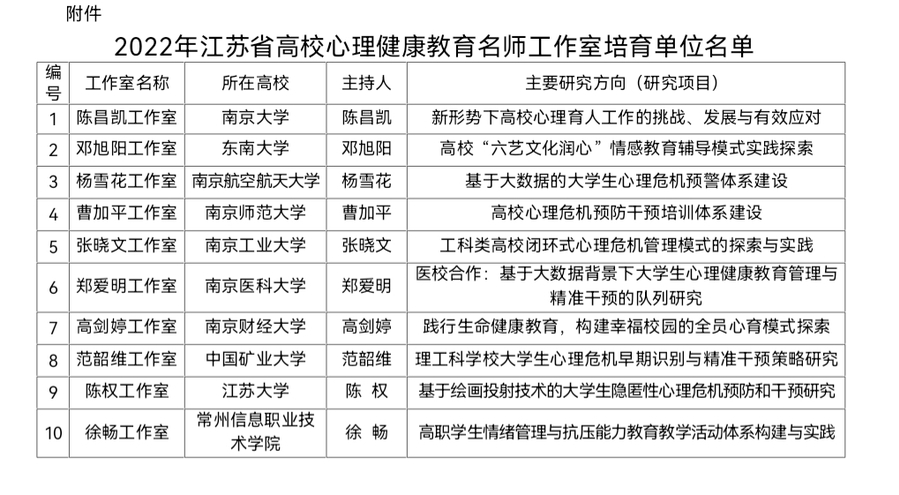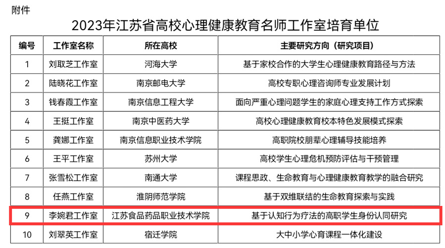 10月7日,江苏省教育厅发布《2023年江苏省高校心理健康教育名师工作室培育单位评审结果公示》,澳洲10手机版“李婉君工作室”获批2023年江苏省高校心理健康教育名师工作室培育单位的十所院校之一。目前,江苏省教育厅共组织两批高校心理健康教育名师工作室培育单位的申报,共20所院校获批,高职院校仅3所,澳洲10手机版位列其中。