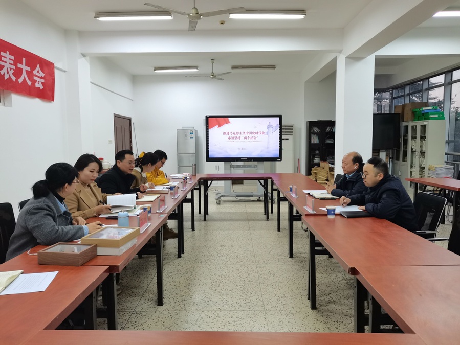 酒店学院党总支书记董道顺以“推进马克思主义中国化时代化必须坚持‘两个结合’”为题进行了领学,深入阐述了“两个结合”的重大意义与理论内涵,并就如何坚持把马克思主义基本原理同中国具体实际相结合、同中华优秀传统文化相结合进行了解读。随后,班子成员分别结合岗位实际,就如何运用“两个结合”指导学院高质量发展进行了交流发言。