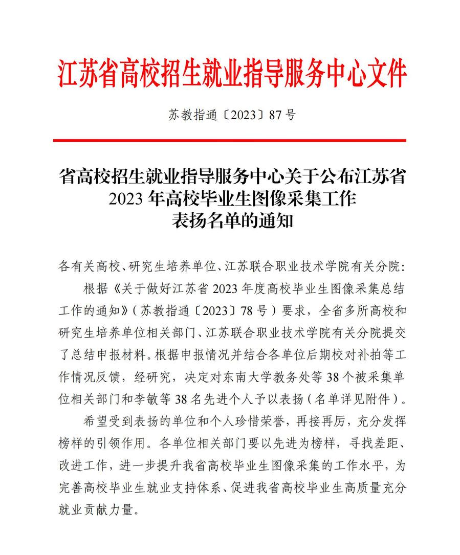 近日,江苏省高校招生就业指导服务中心发布了《关于公布江苏省2023年高校毕业生图像采集工作表扬名单的通知》(苏教指通〔2023〕87号),澳洲10手机版教务处获江苏省2023年高校毕业生图像采集工作优秀组织奖,吉翔同志获先进个人。