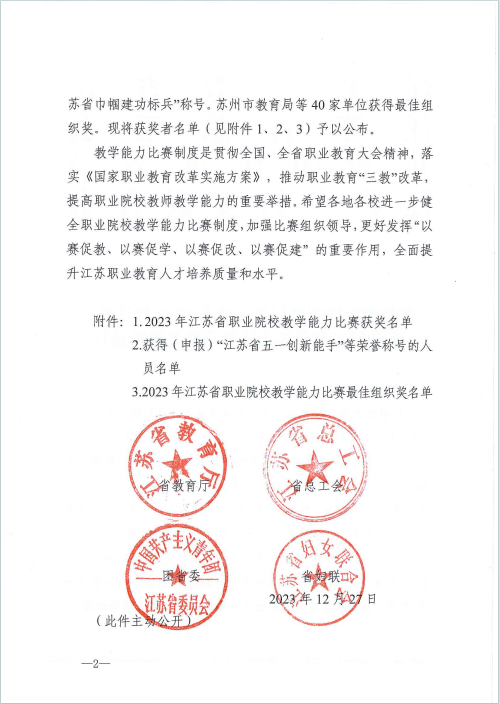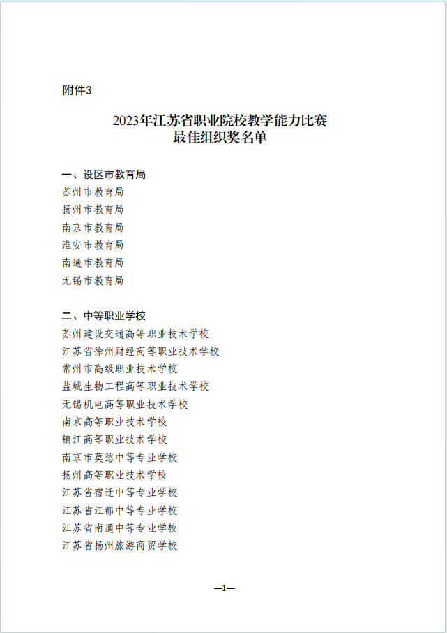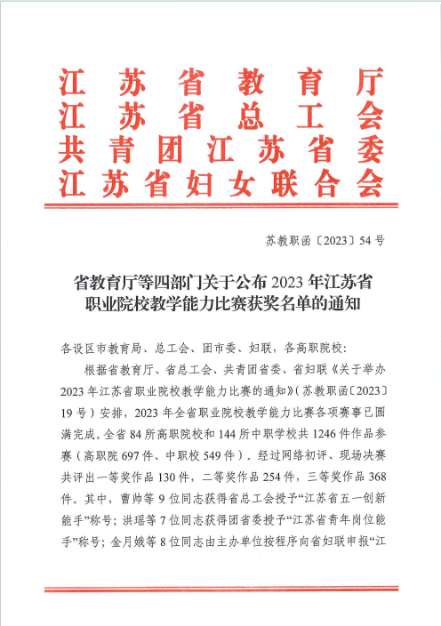 近日,根据《省教育厅等四部门关于公布2023年江苏省职业院校教学能力比赛获奖名单的通知》(苏教职函〔2023〕54 号),澳洲10手机版荣获2023年江苏省职业院校教学能力比赛最佳组织奖,澳洲10手机版已连续两年获此荣誉。