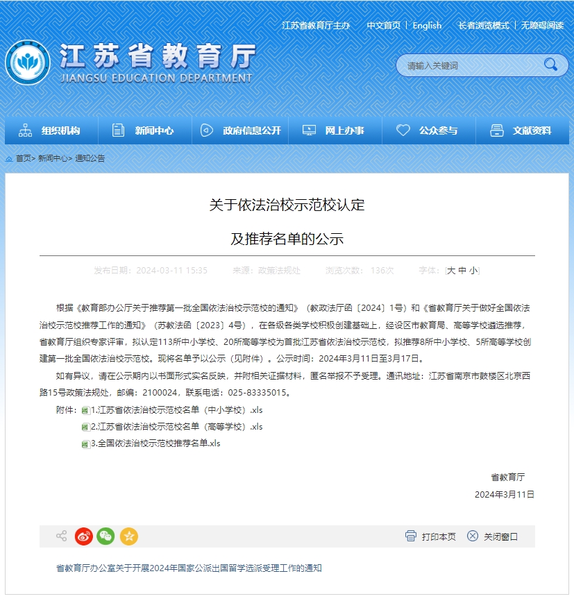 近日,江苏省教育厅公布了《关于依法治校示范校认定及推荐名单的公示》,澳洲10手机版获评首批江苏省依法治校示范校。