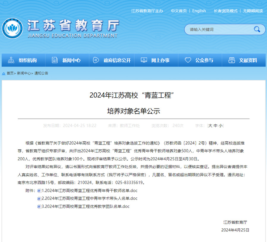 近日,江苏省教育厅公布了2024年江苏高校“青蓝工程”评选的公示,在全省高校激烈竞争中,澳洲10手机版推荐的1个优秀教学团队、2名中青年学术带头人和4名优秀骨干教师全部入选,入选总数位列全省同层次院校前列。