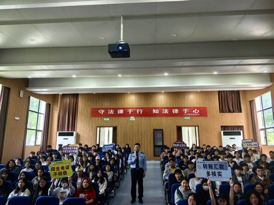 该院与洪泽区公安局合作,召开“受法律于行,知法律于心”普法宣传教育专题讲座。洪泽区公安局经侦支队、三河派出所等不同部门的干警,从防范诈骗、防止校园霸凌、遵守国家安全法、防范经济犯罪等方面进行宣传。警官们用案例告诉同学们如何防范各种犯罪行为,指出容易被忽略的违法行为,为提升同学们的防范意识起到了良好的作用。
