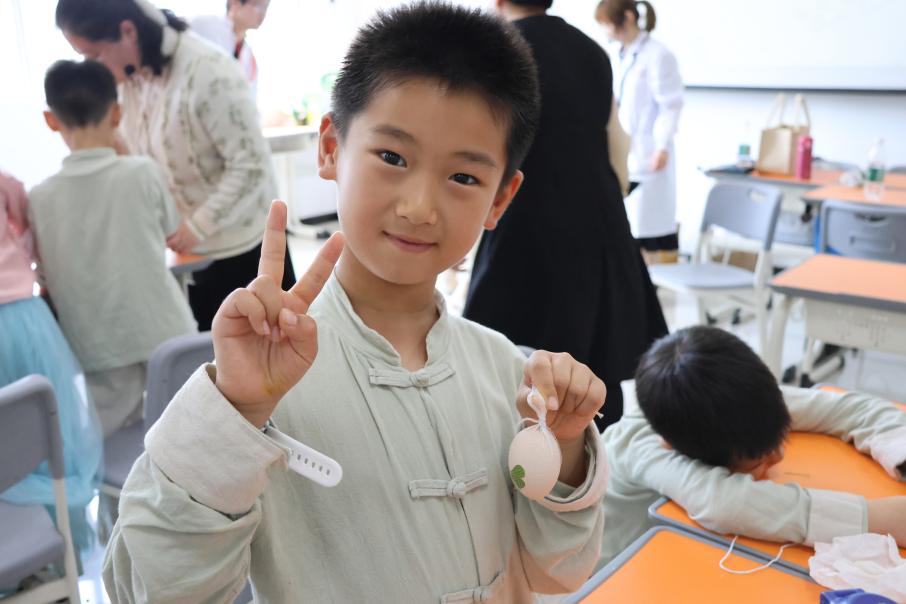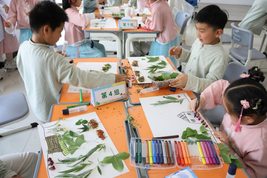 活动首先为各位小朋友们讲解了中药文化体系的形成和中药在生活中的妙用,教同学们辨认了生活中常见的十种药材。然后引导学生们发挥想象,就地取材,利用不同的药草创作属于自己的手贴画作,充分发挥学生们的主观能动性和创造力。随后老师和同学们共同制作了花草蛋,将时令文化特点与中药传统知识相结合,这对小朋友们来说既是一次有趣的尝试,也是一次对自然之美的深刻体验;最后老师们带着孩子们体验天然大漆制作的独一无二的扇面,每个人的图案都非常的别致,充满了意境。